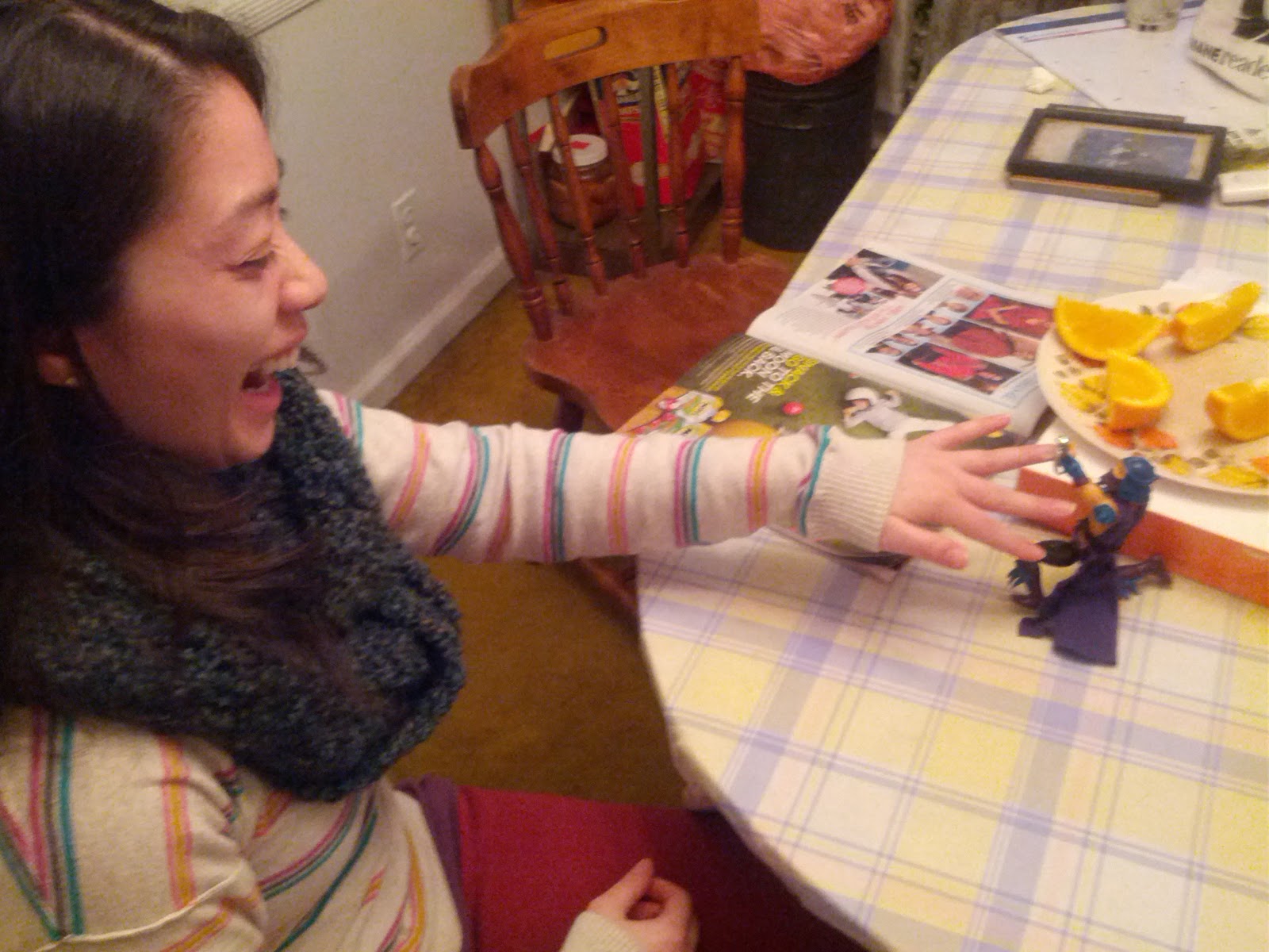 kneeling among the orange slices and donuts.